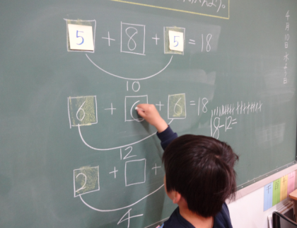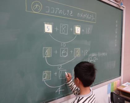 『ココアはいくつ』同じ色の部分には、同じ数をあてはめて、四角の中にはどんな数字が入るか考えました。自分で考えた問題を友だちと出題し合い、とても楽しそうでした。