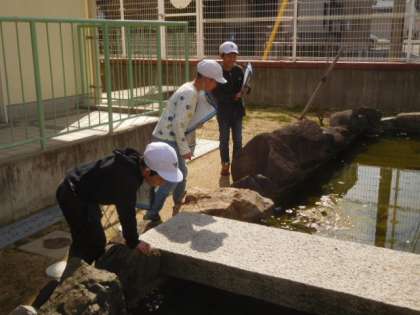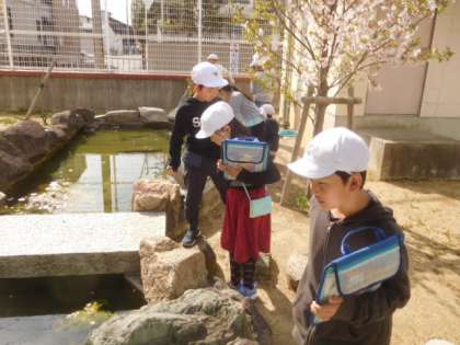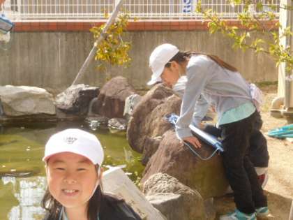 校庭の春の様子を観察しに行きました。いつもは入れない池に行くと,メダカがいました。
