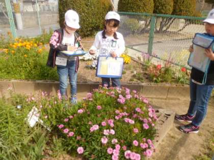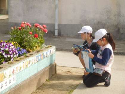東側の花壇には,たくさんの春の花が咲いていました。木の幹からきのこみたいな謎の生き物を発見した人もいました。