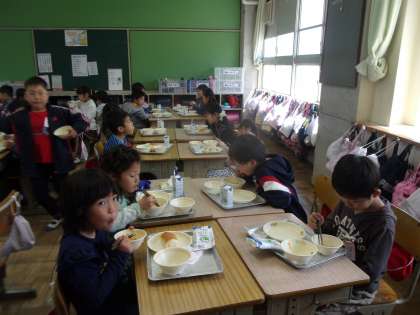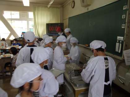 新しい給食当番も2日目ですっかりなれてしっかり準備ができています。おいしい給食をいっぱい食べています。