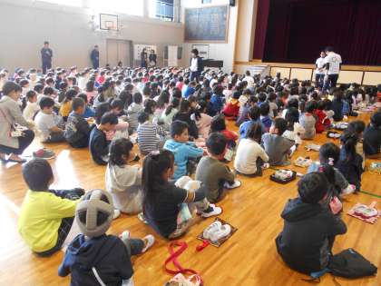 背の順に並んで,全校朝礼に参加しました。
