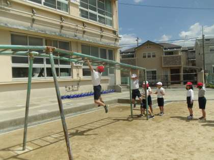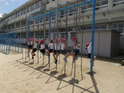 うんていとのぼりぼうをしました。うんていでは,1つずつや1つとばしなどの取り組みました。のぼりぼうでは,のぼりぼうにつかまったり,上までいけるか挑戦したりしました。がんばっている子への応援や,上手にできた子には拍手をするなどあたたかい場面も見られました。