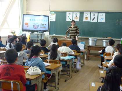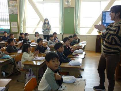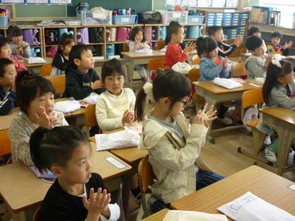 明日より1年生も給食が始まります。今日は,2・3組が栄養教諭の先生に手洗いの仕方,エプロンの着方を教わり,食缶がどれぐらい重たいのかを実際に体験させてもらいました。手洗いは,「あわあわ手洗いのうた」に合わせて練習しました。きれいに手洗い,できるかな?