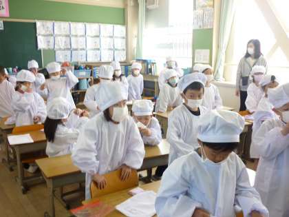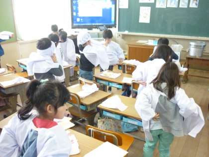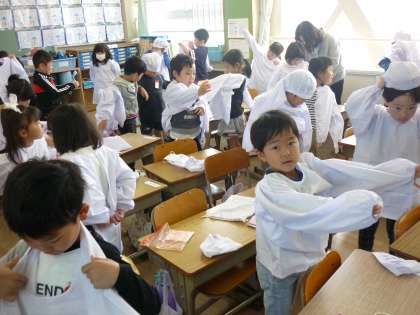 初めてエプロンを着て,たたむところまで練習しました。髪の毛は帽子の中にしまい,マスクは鼻まで覆います。体を台にしてたたむのは難しかったですが,上手に袋の中にしまうことができました。明日のメニューはカレーと聞いて,「わ〜!楽しみ!」と大喜びでした。