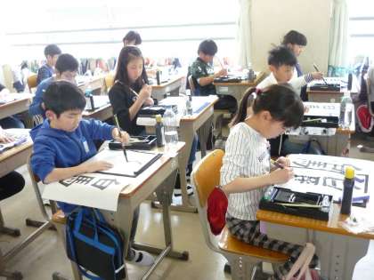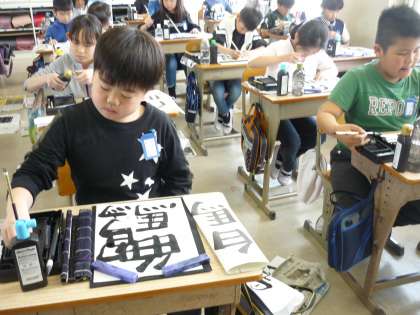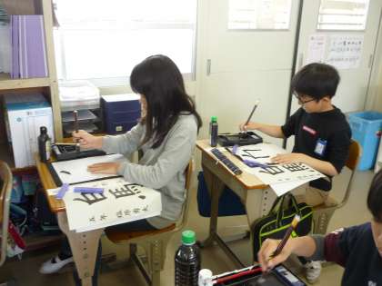 「白馬」という字を筆で書きました。姿勢よく筆は立てることを意識して練習しました。