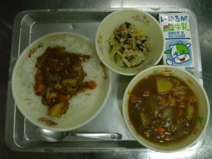 今日の給食は「ごはん、牛乳、チキンカレーライス、和風サラダ、手作りドレッシング」でした。今日から1年生の給食も始まりました。初日がカレーライスで給食をとても楽しみにしていて、「おいしい〜」と笑顔で食べていました。