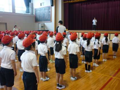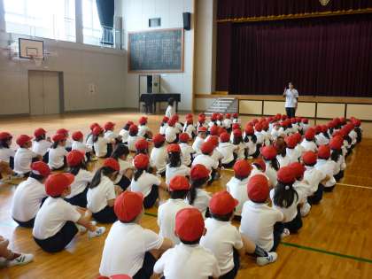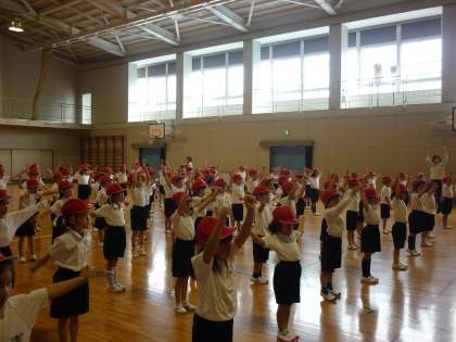 初めての体育館体育でした。学年で,整列や号令,ラジオ体操の練習をしました。「前へならえ」「休め」などの言葉をよく聞き分けて行動していました。