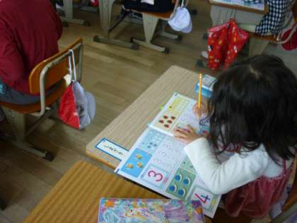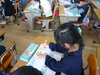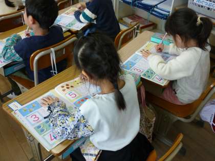 静かにいい姿勢で,平仮名や数字を学習しています。下敷きを敷く,ノートを手で押さえるなど,一つ一つ確認しながら取り組みました。