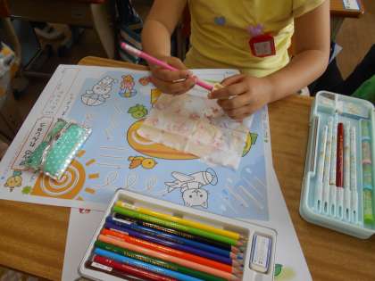 →今,授業中は着席することを教えています。色鉛筆を削るたびに立ち歩かず,手元で削り,授業終了後に削りかすを捨てることも教えているところです。