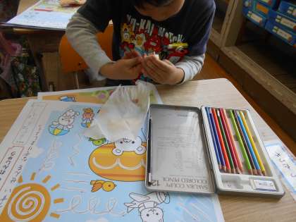 色鉛筆についている削り器を使っている子は,写真のようにティッシュの上で削り,終了後に捨てています。
