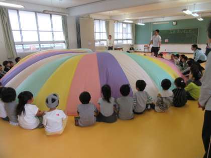 なかよし学級の教具を紹介して一緒に体験したり,音楽に合わせてバルーンを動かしたりして楽しく交流しました。