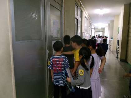 1年生に学校を案内しました。いろいろな教室についてどんなところか説明して,見学した記念のスタンプをおしてあげました。