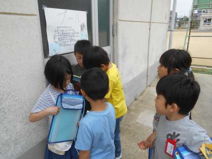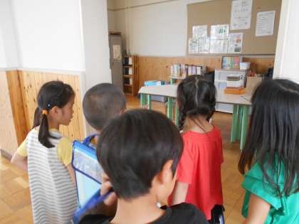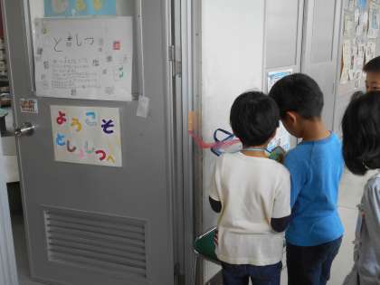 ランチルームや図書室,プールなど,まだ入ったことや見たことのない教室をのぞいたり,実際に入ってみたりしました。1年生は興味津々です。