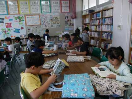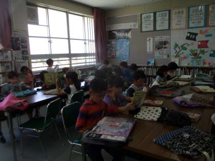 図書では,かりる本を選んだ人から席に座って読書をします。連休明けでしたが,みんな集中して読書をすることができました。