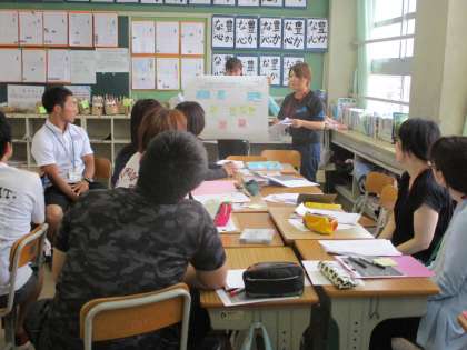 授業の後、検討会で,授業の見る視点等についての意見を出し合い,議論を深めました。