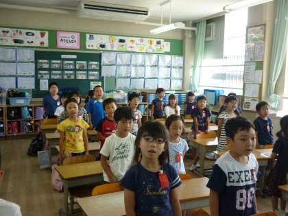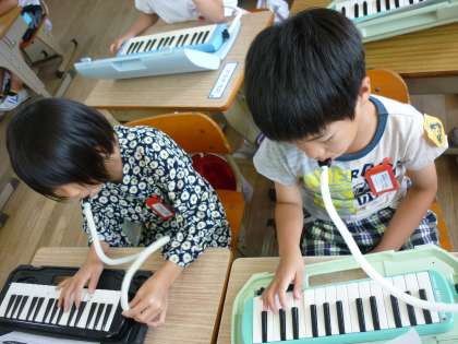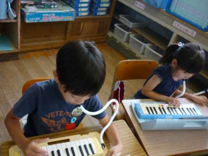 6月の季節に合う,「にじ」「カタツムリ」を歌っています。鍵盤ハーモニカの学習にも入りました。今日はドキドキのテストです。