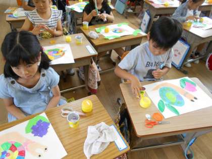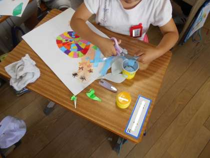 こまかく切った花びらをお花に見えるように貼りつけていきました。