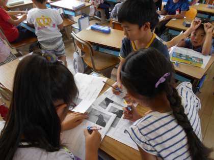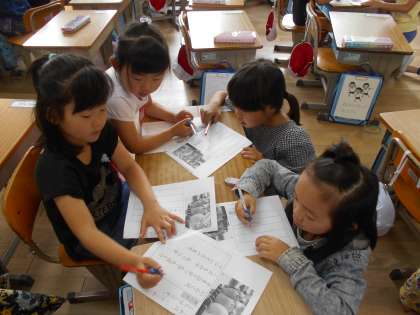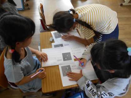 今日の学習で,同じ鳥のクイズ仲間で集まり,クイズワークを書いて練習しました。