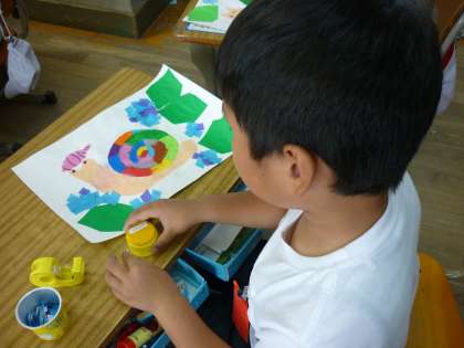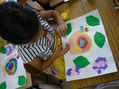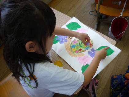 「おしゃれなかたつむり」の完成まであと少しです。今日は,細かく切った折り紙を貼って,あじさいの花を作りました。