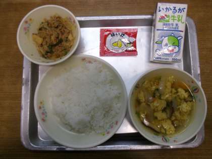 6月19日の給食は「ごはん、牛乳、サンラータン、チンジャオロース、ふりかけ」でした。サンラータンは中華料理の1つです。酢を使うので、少し酸味のある卵入りのスープです。
