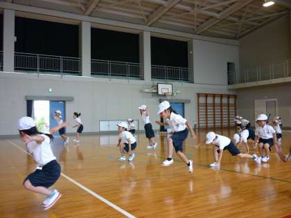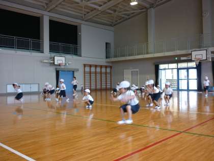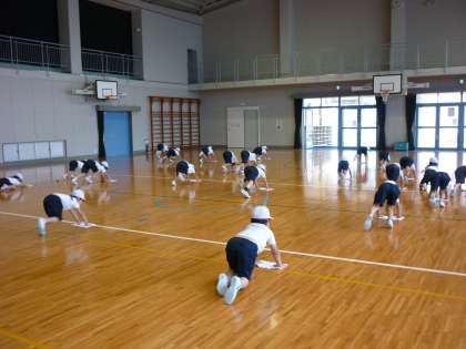 雑巾レースは大盛り上がり,帰りはうさぎになりきります。みんな上手に跳ねています。