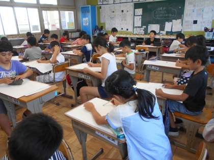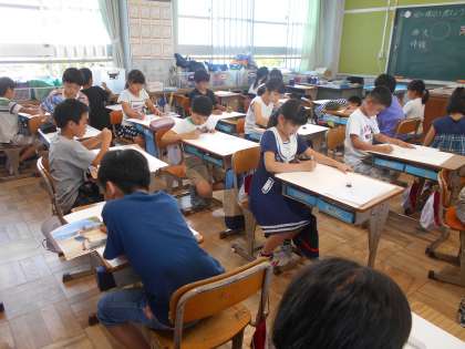 体育大会の絵に取り組んでいます。エイサーや台風の目,徒競走など,一番心に残っている自分の姿を描きます。