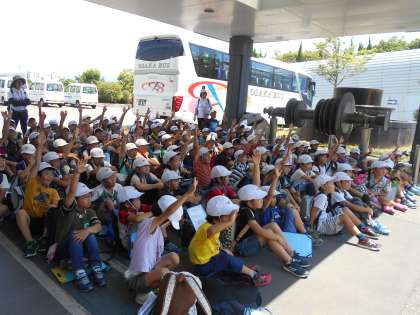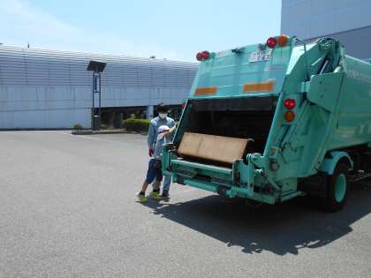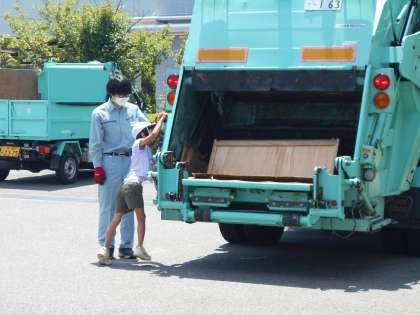 午後は,クリーンセンター東工場の見学です。パッカー車の実演にみんな興奮気味でした。