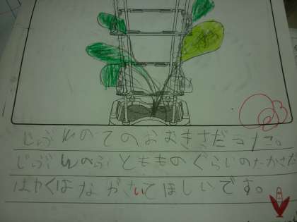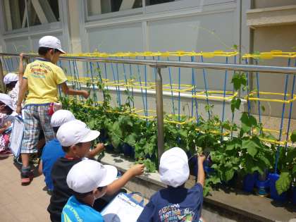 あさがおの観察を続けています。今週に入り,花が咲いた子が数人出てきました。「先生〜!!あさがお咲いてる〜!!」と大興奮です。観察カードには,「○○くらいのたかさ,おおきさ」と,くわしく書ける人が増えてきました。これからどんな色の花が咲くのかわくわくしながら水やりをしています。