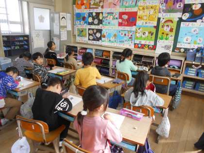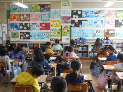 教室後ろに掲示している,友だちの作品を鑑賞しました。