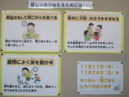 11月11日(月)〜11月24日(日)の2週間,全校ですいみん・朝ごはん調査の取組を実施しますので,ご家庭でもご協力をお願いします。