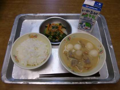 今日の給食は「ごはん,牛乳,みそおでん,小松菜のお浸し」でした。
