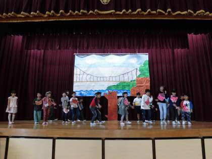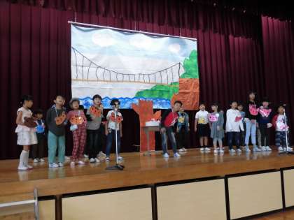 いよいよ明日は,学習発表会の校内発表です。三年生に手伝ってもらったバック絵もでき,緊張しながら練習しました。明日,がんばるぞ!エイエイオーーー!!!!!