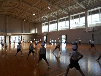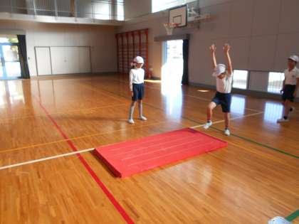 側方倒立回転に挑戦しました。手や足のつく順番,腰の位置や腕の伸びなど,友達どうしで見合って,教え合いました。