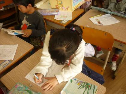 「ずうっとずっと,大すきだよ」の紹介カードを作りました。1.どんなお話か,2.おすすめするところはどこかを考えて書きました。