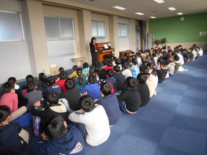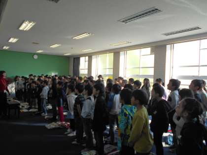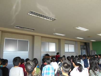 4年生合同で音楽の学習です。今日は校長先生に教えていただくので,朝からみんなドキドキしていました。校長先生に歌声をほめてもらって,みんなうれしそうでした。