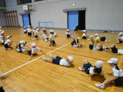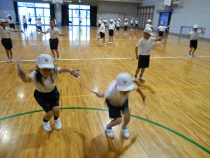 奇妙なラジオ体操や二人で合体縄跳びなどをしました。