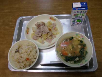今日の給食は「炊き込みご飯,牛乳,みそマヨガーリック焼き,だんご汁」でした。