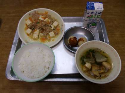 今日の給食は「ごはん,牛乳,豆腐の五目あんかけ,たこ焼き、船場汁」でした。