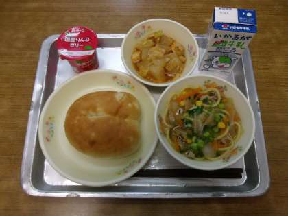 今日の給食は「おさつパン,牛乳,ピリ辛大根,しょうゆラーメン,フルーツゼリー(アップル)」でした。