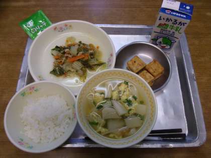 今日の給食は「ごはん,牛乳,大阪しろ菜と豚肉の炒め煮,厚揚げのみぞれ掛け,長芋のかきたま汁」でした。