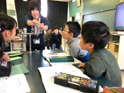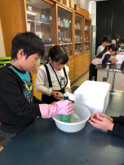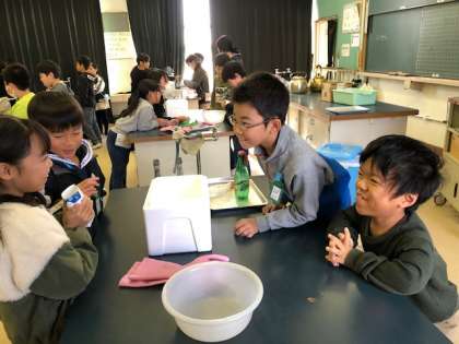理科室で「空気の温度と体積」の実験をしました。60度のお湯につけた丸底フラスコの栓が飛んだり,試験管の口につけた台所洗剤の膜が膨らんだり,ビンの口につけた風船がふくらんだりしたので,空気は温められると体積が大きくなるということがわかりました。また,氷水で冷やした場合の変化も興味深そうに実験していました。