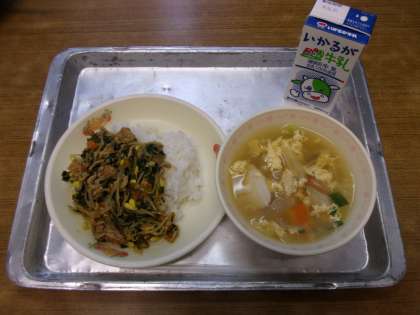 今日の給食は「ごはん,牛乳,ビビンバ風,トック」でした。