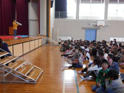 児童会は司会をします。チャレンジフェスタ、盛り上がっています。
