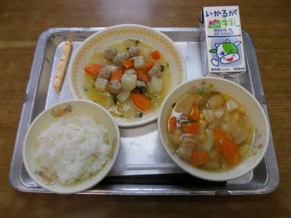 今日の給食は「ごはん,牛乳,肉団子とカブのあんかけ,石狩汁,スティックチーズ」でした。」
