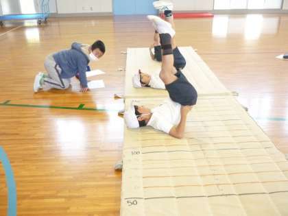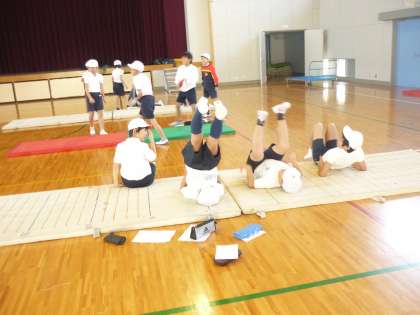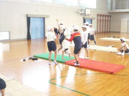 マット運動のテストに向けて、グループで苦手な技の教え合いをしました。アドバイスをしたり見合ったりします。