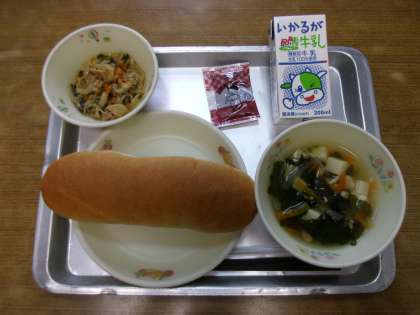 今日の給食は「コッペパン,牛乳,切り干し大根のエスニック炒め,ワカメスープ,チョコレートクリーム」でした。