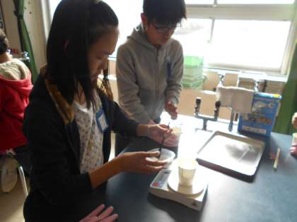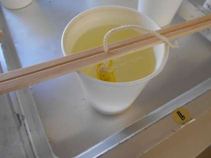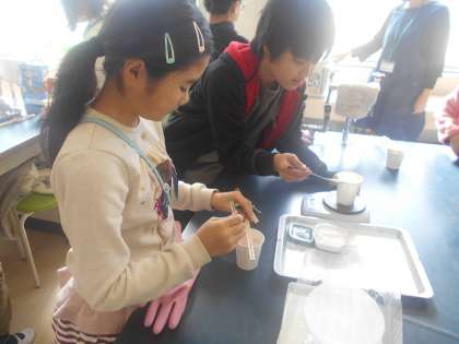 ミョウバンを飽和させ,結晶づくりをしました。時間が経って,水温が下がるのを待ちます。