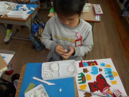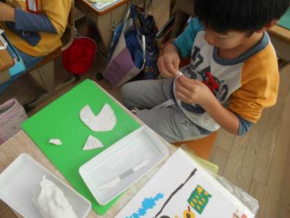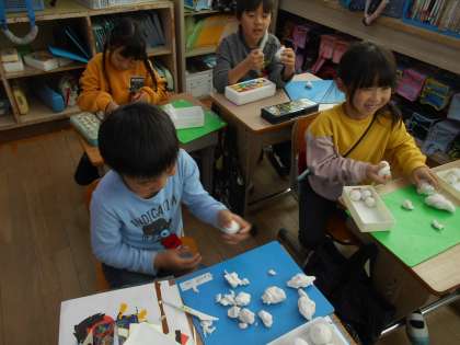 版画を刷るのに順番待ちの間や,刷り終わった子たちから,粘土をしています。