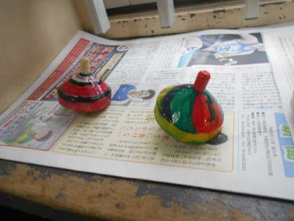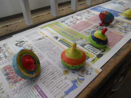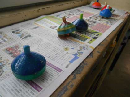 ふと1年生の靴箱の上を見てみると,色とりどりのオリジナルこまがありました。乾いて,回して遊ぶのが今から楽しみですね。