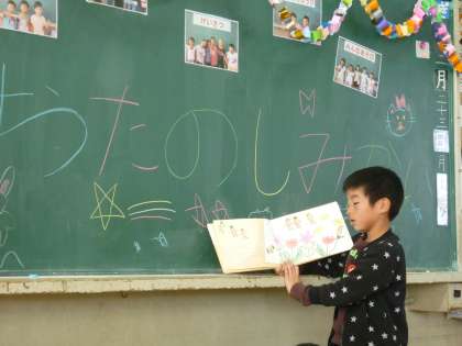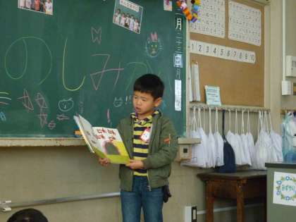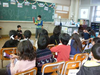 2学期最後のお楽しみ会をしました。それぞれの係で準備したことを発表します。図書係は,おすすめの絵本の読み聞かせをしてくれました。